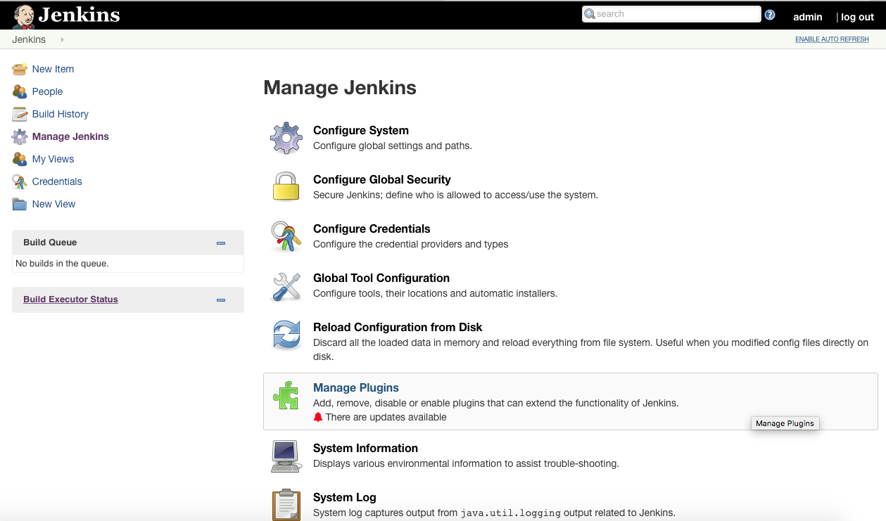 返回主Jenkins仪表盘,点击Manage Jenkins,然后选择Manage Plugins: