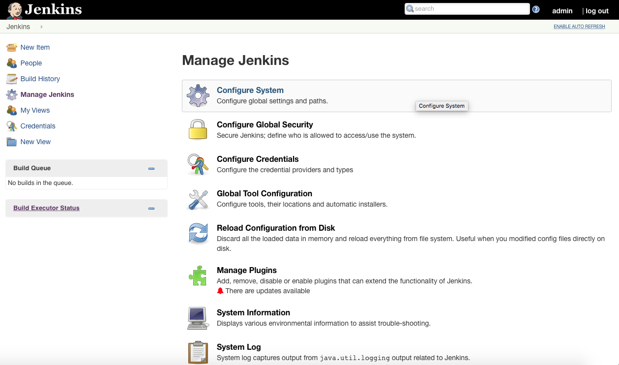 现在我们来配置插件。前往Manage Jenkins并选择Configure System: