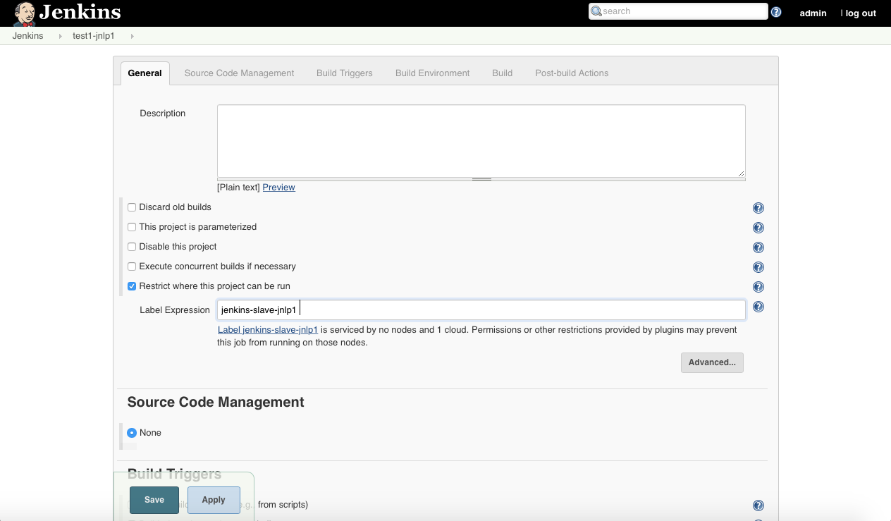 在下一页的Label Expression字段中,输入你为第一个Jenkins代理镜像设置的标签,如果单击字段之外,会出现一条消息,提示标签由云提供服务。