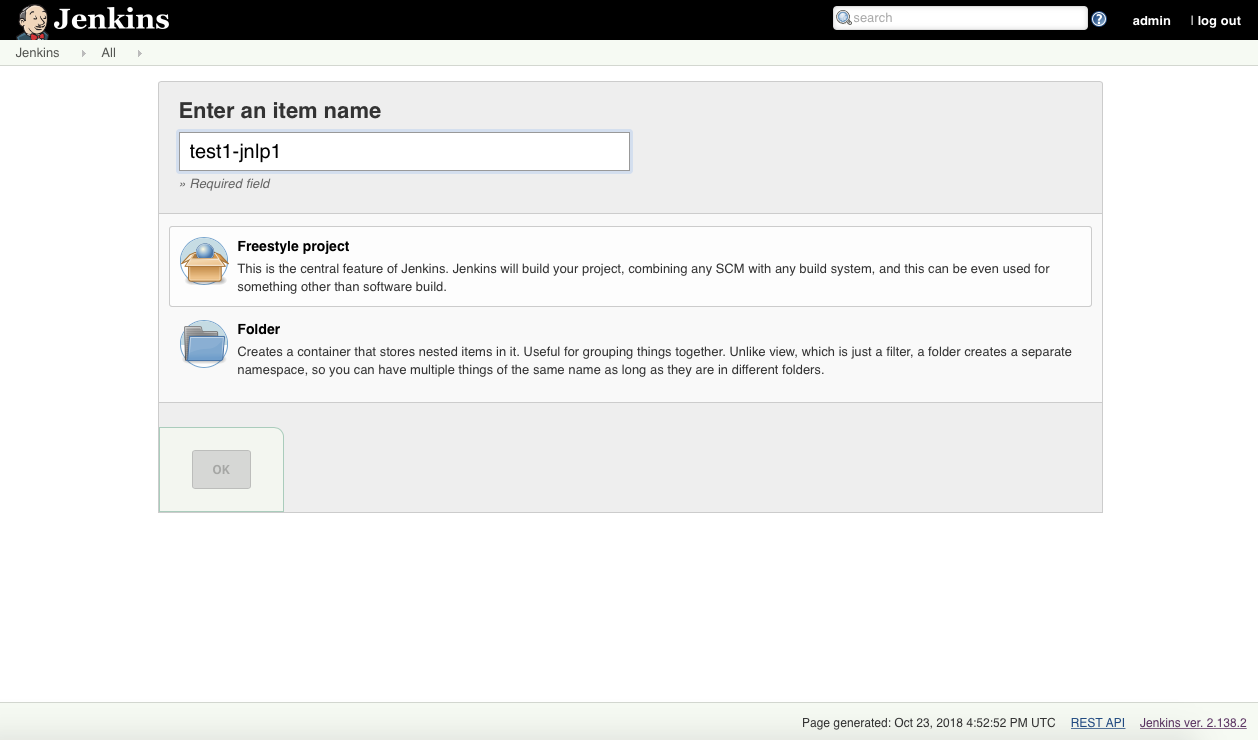 在Jenkins主页面,单击左侧的New Item,为第一个代理的第一个构建输入名称,选择Freestyle project并单击OK按钮。