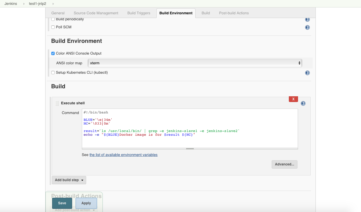 向下滚动到Build Environment部分,检查Color ANSI Console Output。