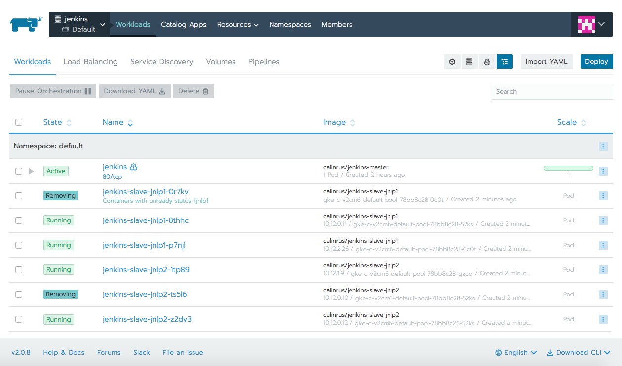 大约几秒钟之后,会开始创建Pods来执行构建(你可以在Rancher的Workload选项卡中检验这一点)。Jenkins会为每个作业创建一个pod。在每个代理启动时,它连接到master并从队列中接收要执行的作业。