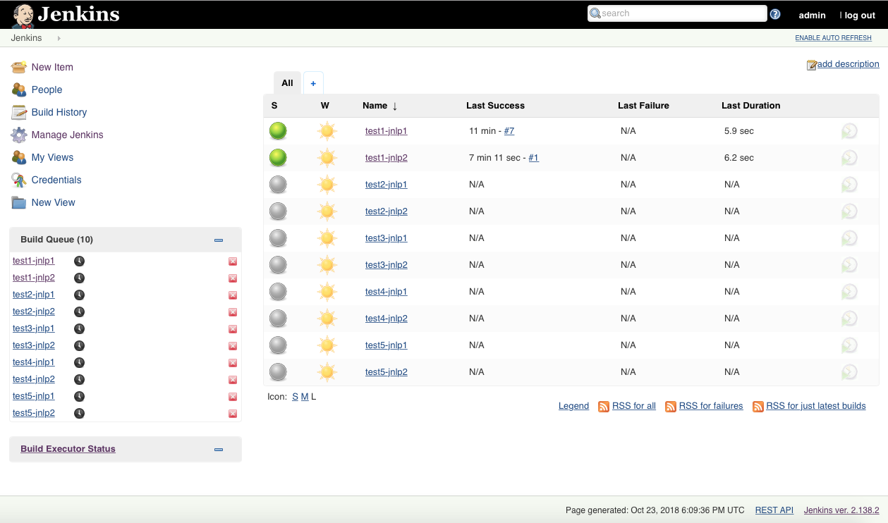 现在,转回到主页面,单击每行最右边的图标,启动全部刚刚创建的10个作业。在启动之后,它们会按照Build Queue部分的指示排队等待执行: