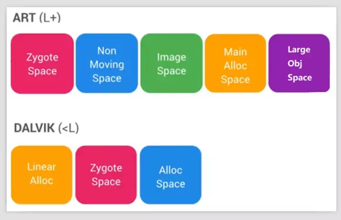 - ART 虚拟机则在 Dalvik 虚拟机阻塞性 GC 的基础上,扩展了并发 GC 算法,消除了大面积的 GC 阻塞时间(当然也不是说全程不阻塞,在某一小段时间内还是会出现“Stop the world”),提升了 GC 的性能,也在一定的程度上优化了卡顿情况:
