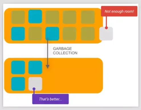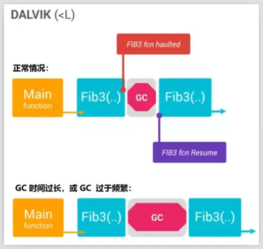- Dalvik 虚拟机在 GC 的整个流程中,绝大部分时间会“Stop the world”,即暂停所有线程(包括负责渲染界面的主线程)的执行,只执行 GC 线程,直至 GC 完成,这就会导致一个问题“当 GC 过于频繁时,阻塞了主线程,导致丢帧(Android 系统每 16ms 渲染一帧),最终导致界面的卡顿”: