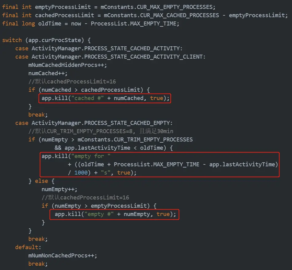 默认限制 empty 或 cached 进程的上限为 16 个,并且 empty 超过 8 个时会清理掉 30 分钟没有活跃的进程。 cached 和 empty 主要是区别是否有 Activity。