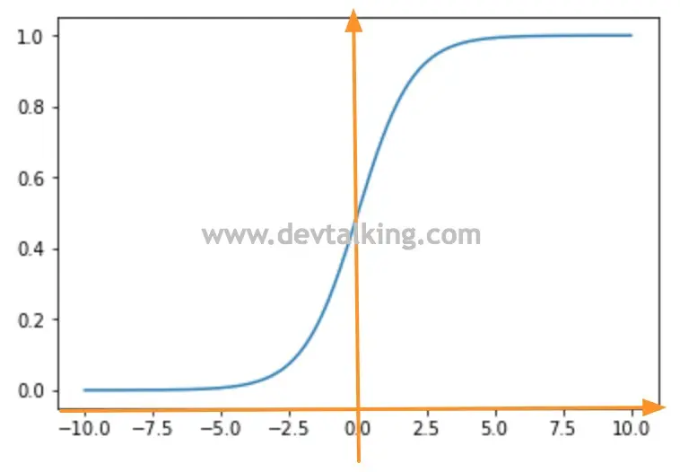 我将坐标轴在Sigmoid曲线图上绘制出来,可以看到当