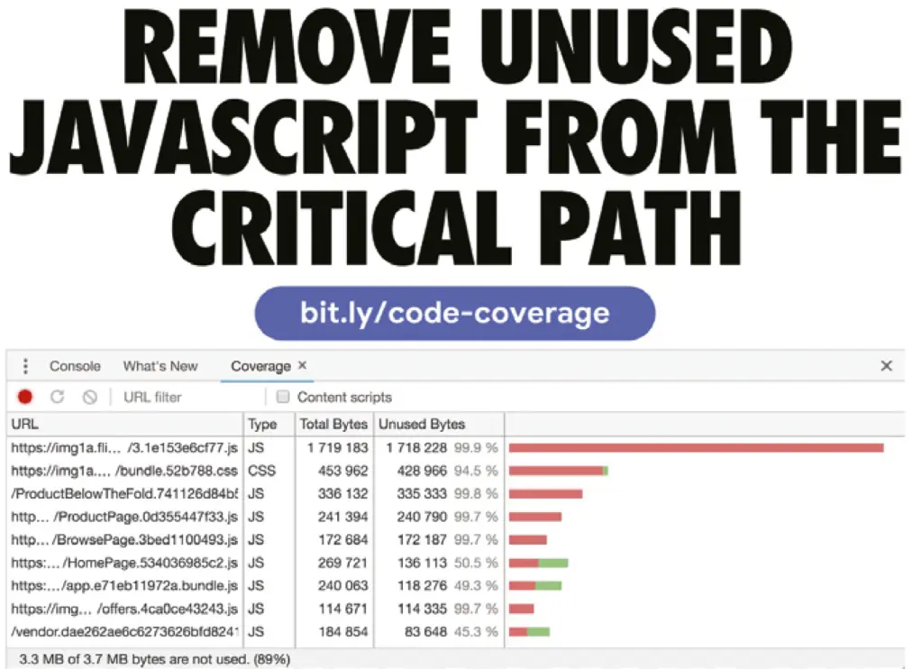 还有一件值得你监控和关注的事情,就是检查有没有将未使用的代码发送给用户, code coverage(developers.google.com/web/updates…)——谷歌浏览器开发者工具中的代码覆盖率面板,此面板内会告诉你哪些代码未使用,哪些又是使用了的。这样可以精简掉未使用的代码来减小页面的大小。