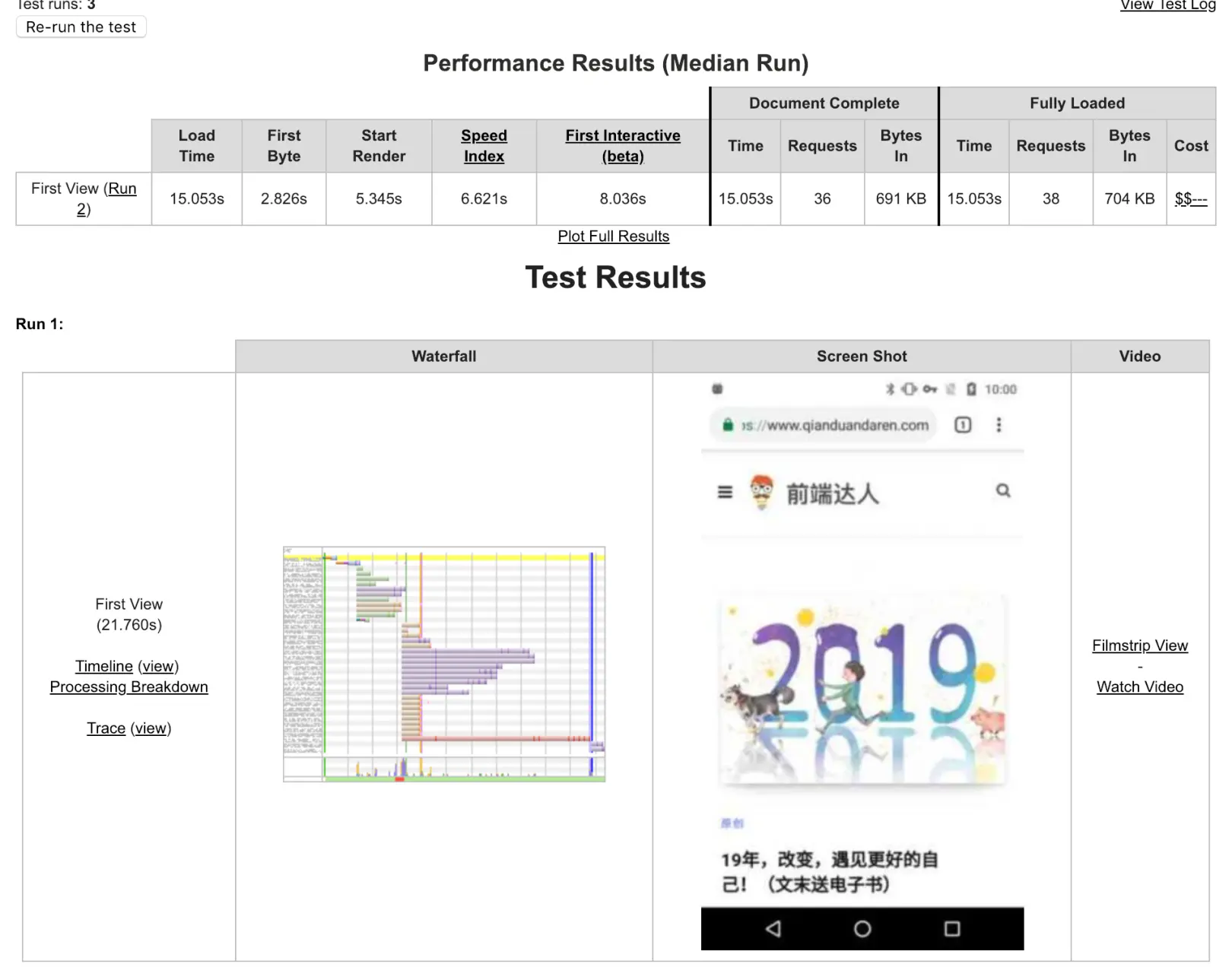 现实就是这样,并非每个人都用得起高端手机,还有大部分用户使用中低端手机。由于中低端手机CPU,GPU的限制,处理JavaScript等资源的时间也不同。因此我们应该在真实的手机环境和网络环境下测试至关重要。检查分析您的用户访问行为至关重要,如果您无法购买太多中低端手机进行测试,你可以使用这个在线网站工具WebPageTest(webpagetest.org/easy),进行在线测试。(以下是小编前端达人www.qianduandaren.com的测试效果)