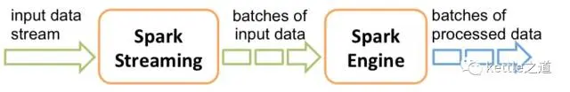 spark streaming实时接收输入数据流,并根据时间将数据流分成连续的多个batch,然后由Spark引擎一次处理一批数据,以批量生成最终结果流,工作流程图: