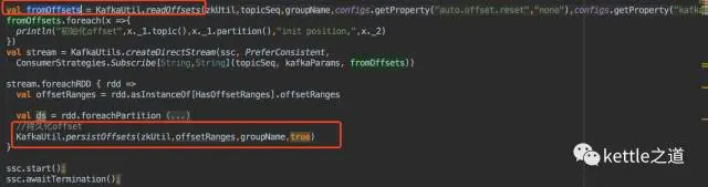 在完成kafka DStream处理后,调用persistOffsets方法持久化保存分区的偏移量