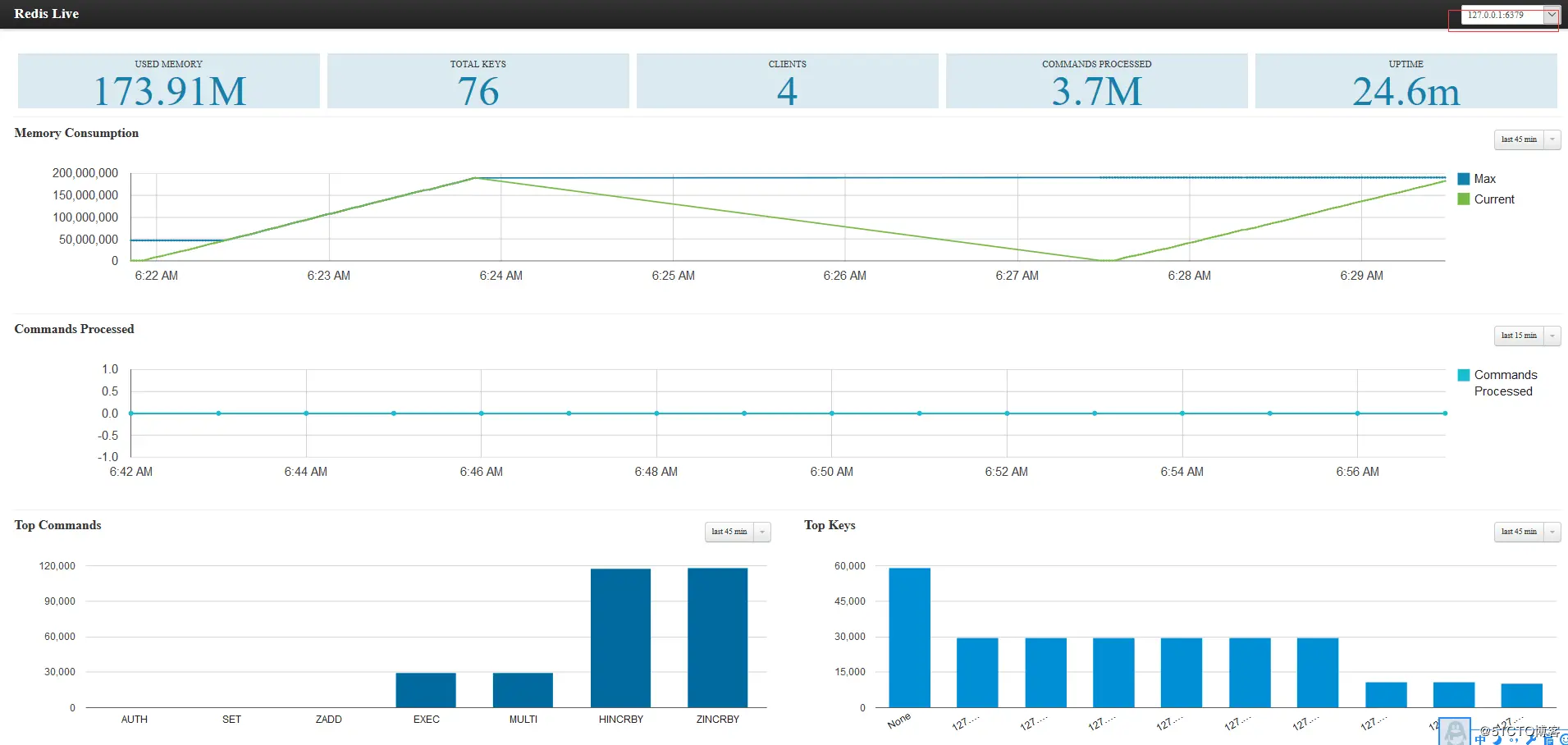 RedisLive是由python编写的并且开源的图形化监控工具,非常轻量级,核心服务部分只包含一个web服务和一个基于redis自带的info命令以及monitor命令的监控服务,界面上只有一个基于BootStrap的web界面,非常简洁明了。除此之外,它还支持多实例监控,切换方便,而且配置起来也非常容易。监控信息支持redis存储和持久化存储(sqlite)两种方式。 操作方式可以参考:RedisLive监控Redis服务