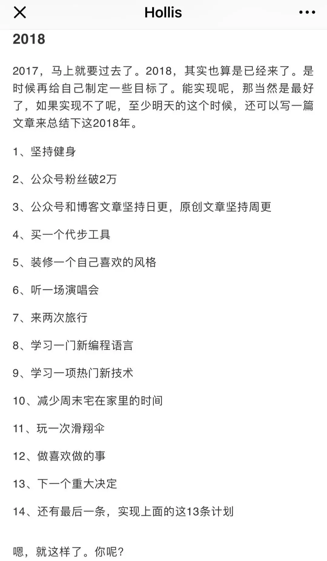 Hollis的2019年计划如下,与君共勉: