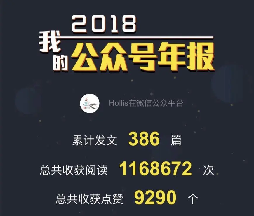 2、2018年度,Hollis公众号共发文总数386篇,原创文章133篇,共收获阅读1168672次,共收获点赞数9290个。