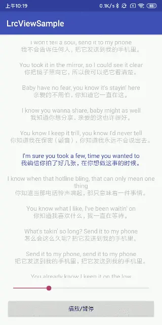 Android歌词控件,支持上下拖动歌词,歌词自动换行,自定义属性,支持双语歌词。