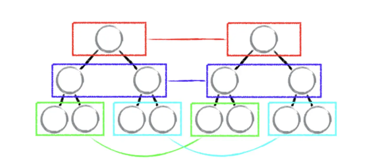 既然 DOM 节点跨层级的移动操作少到可以忽略不计,针对这一现象,React 通过 updateDepth 对 Virtual DOM 树进行层级控制,只会对相同颜色方框内的 DOM 节点进行比较,即同一个父节点下的所有子节点。当发现节点已经不存在,则该节点及其子节点会被完全删除掉,不会用于进一步的比较。这样只需要对树进行一次遍历,便能完成整个 DOM 树的比较。