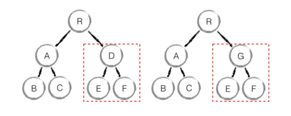如下图,当 component D 改变为 component G 时,即使这两个 component 结构相似,一旦 React 判断 D 和 G 是不同类型的组件,就不会比较二者的结构,而是直接删除 component D,重新创建 component G 以及其子节点。虽然当两个 component 是不同类型但结构相似时,React diff 会影响性能,但正如 React 官方博客所言:不同类型的 component 是很少存在相似 DOM tree 的机会,因此这种极端因素很难在实现开发过程中造成重大影响的。