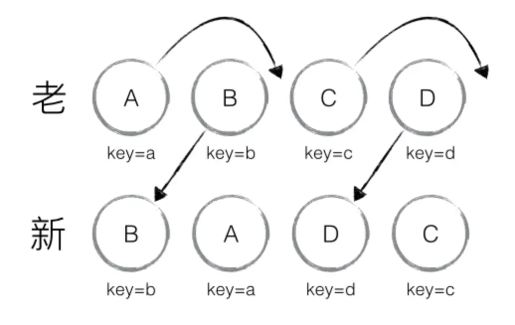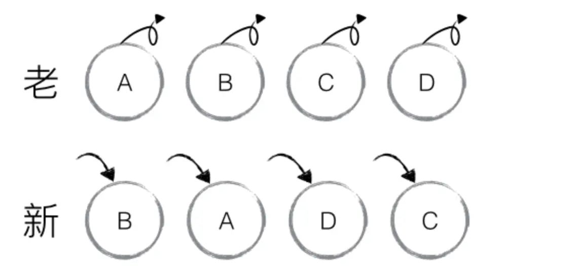 如下图,老集合中包含节点:A、B、C、D,更新后的新集合中包含节点:B、A、D、C,此时新老集合进行 diff 差异化对比,发现 B != A,则创建并插入 B 至新集合,删除老集合 A;以此类推,创建并插入 A、D 和 C,删除 B、C 和 D。