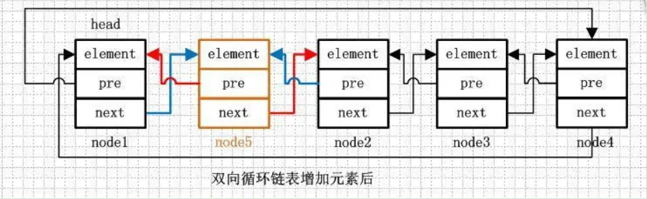双向循环链表和双向链表的不同在于,第一个节点的pre指向最后一个节点,最后一个节点的next指向第一个节点,也形成一个“环”。而LinkedList就是基于双向循环链表设计的。