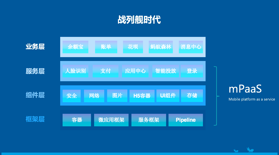 我们将服务层、组件层和框架层合称为 mPaaS,即移动端上的 PaaS 服务。这些 PaaS 服务可以复用,我们不仅在支付宝里使用它们,也在其他集团应用,如蚂蚁财富、网商银行等中使用。