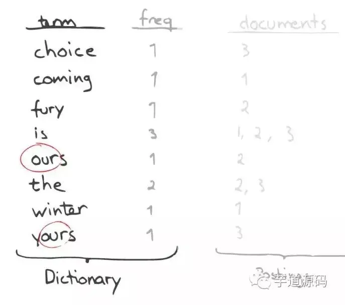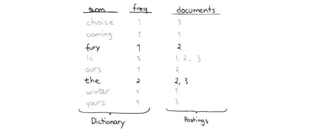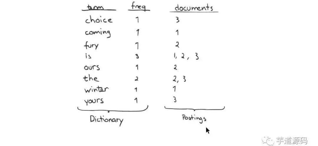 一个有序的数据字典Dictionary(包括单词Term和它出现的频率)。