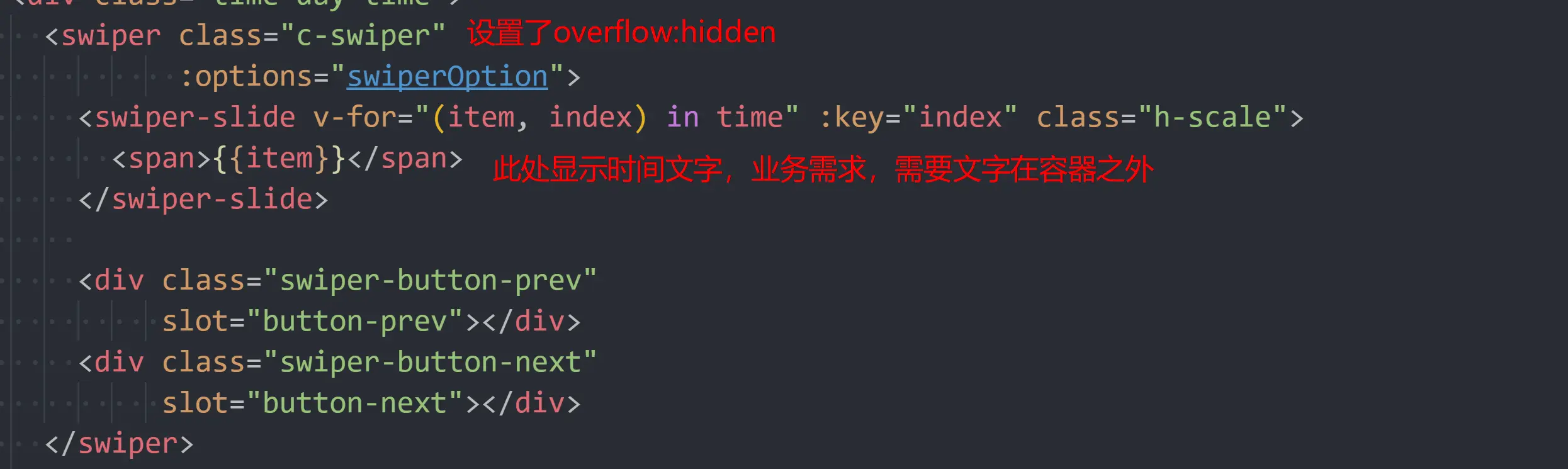 设置子父元素overflow:hidden,子元素absolute不显示问题 关耳水兽 2019-01-11 4,199 阅读1分钟 需求描述 vue项目用的vue-awesome-swiper插件 实现下图结果: 为什么 溢出来的元素自然就隐藏了 解决 首先我想到了给swiper容器overflow-x:hidden然后overflow-y:visible没想到出来了下面的效果 最后看到一篇文章来到了灵感,我给最外面的盒子设置了padding-bottom:20px margin-bottom-20px解决