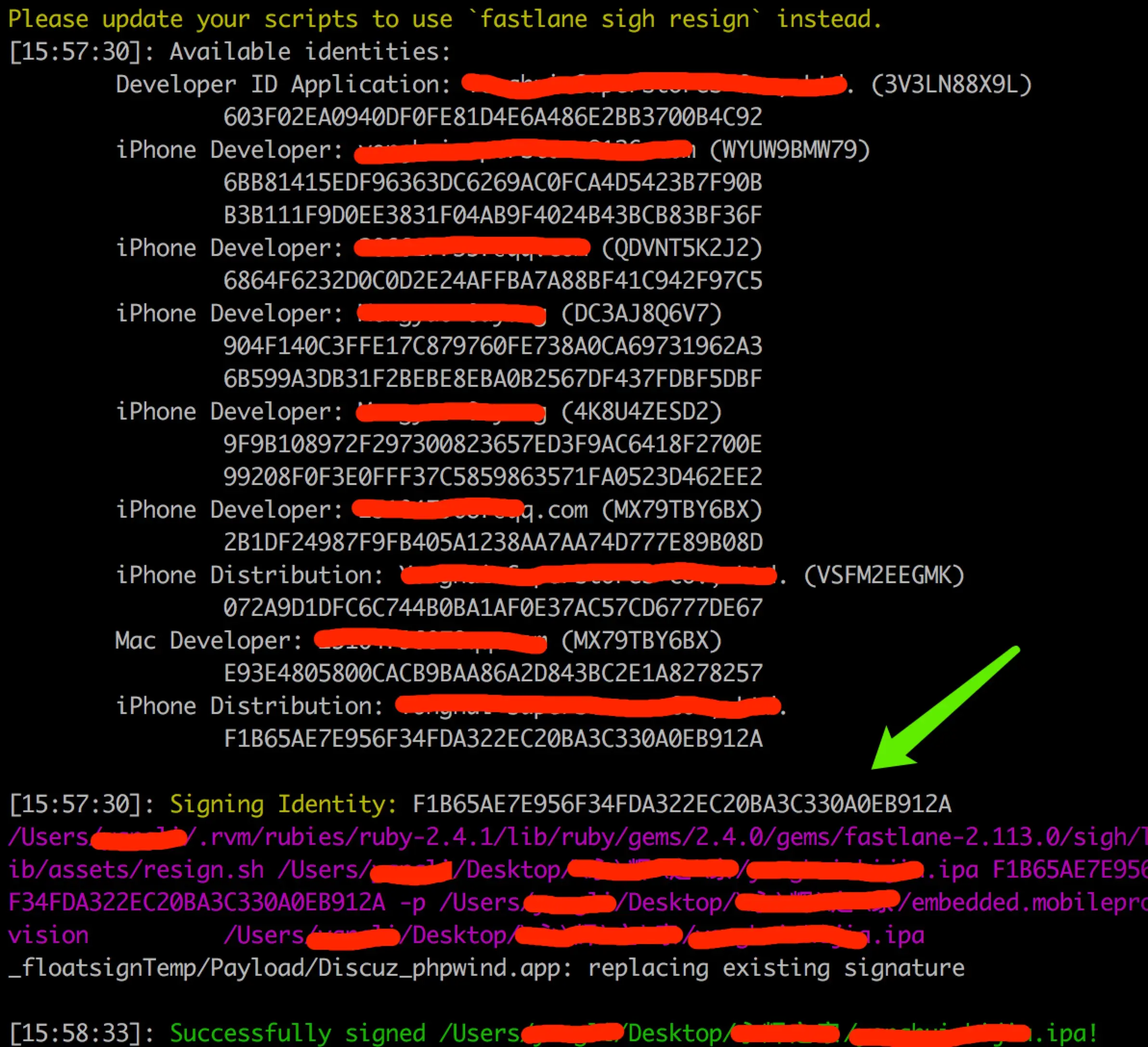 - 这时候,sigh 会直接弹出下面这个指令要你输入:Signing Identity(这个就是你的证书的十六进制串),输入之后,然后你的ipa文件就直接被重签了,可以放到蒲公英等第三方平台测试ipa的正确性