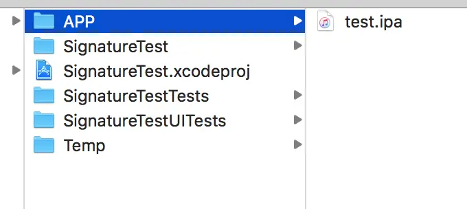 - 新建工程,并在工程根目录添加两个文件夹:APP和Temp(APP和Temp主要是跟脚本里面的ASSETS_PATH、TEMP_PATH一一对应,可修改),APP目录下放你要重签名的ipa,如图