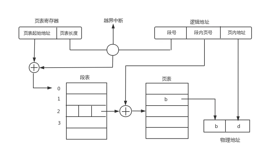 在进行地址转换时,首先将段号与段长进行比较,如果段号小于段长表示未越界,于是利用段表始址和段号求出该段所对应的段表项在段表中的位置,从中得到该段的页表始址,并利用逻辑地址中的段内页号来获得对应页的页表项位置,从中读出该页所在的物理块号,再利用块号和页内地址来得到物理地址。