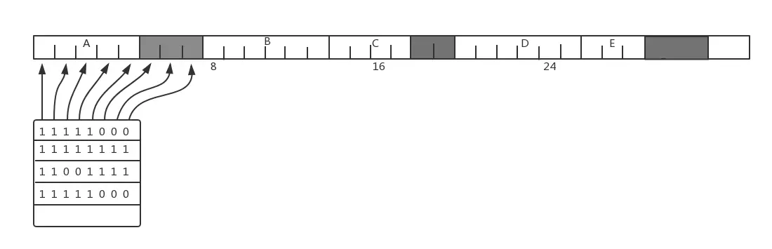 位图的缺点是如果想要调入一个占 k 个分配单元的进程,必须搜索位图,找出有 k 个连续 0 的串。查找位图中指定长度的连续 0 串的操作很耗时。