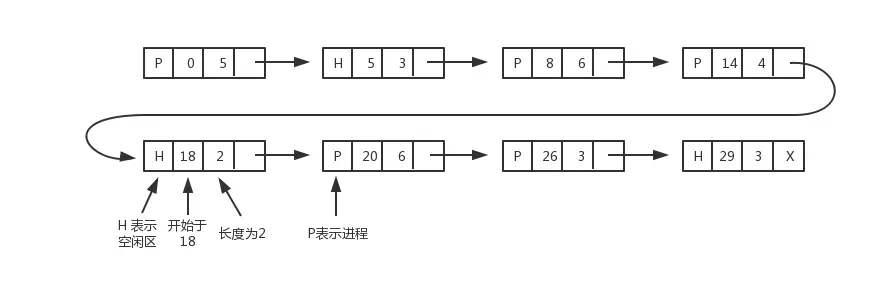 链表法是维护一个已分配内存段和空闲内存段的链表。链表的结点包括一个进程,或两个进程间的一块空闲区。