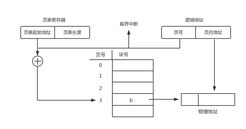 在进行地址转换时,首先将页号与页表长度进行比较,如果页号大于或等于页表长度,则表示本次所访问地址已超过进程的地址空间,产生越界中断。如果没有发生越界中断,则将页表始址与页号和页表项长度的乘积相加,得到该页表项在页表中的位置,于是可从中得到该页的物理块号,最后根据物理块号和页内地址便可得到物理地址。