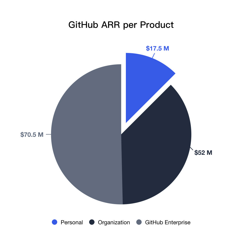 从图上我们可以看出在个人版的私有仓库业务收入占到了总收入将近 13% 的比例。这也是为什么在 GitLab、Bitbucket 等竞品纷纷推出免费的私有仓库的时候,GitHub 还在坚持收费的原因,因为企业版和私有仓库并没有那么明显的互补关系,即使将私有仓库免费,扩大用户,也不能直接促进企业版的收入。 虽然都是给开发者用的产品,但是个人用跟公司用是完全不同的两件事。这里面其实是两个市场,两类用户,两种场景。把个人版用户转化为企业版用户是极低概率的事情。这也是为什么 CODING 要彻底区分个人版和企业版的原因。