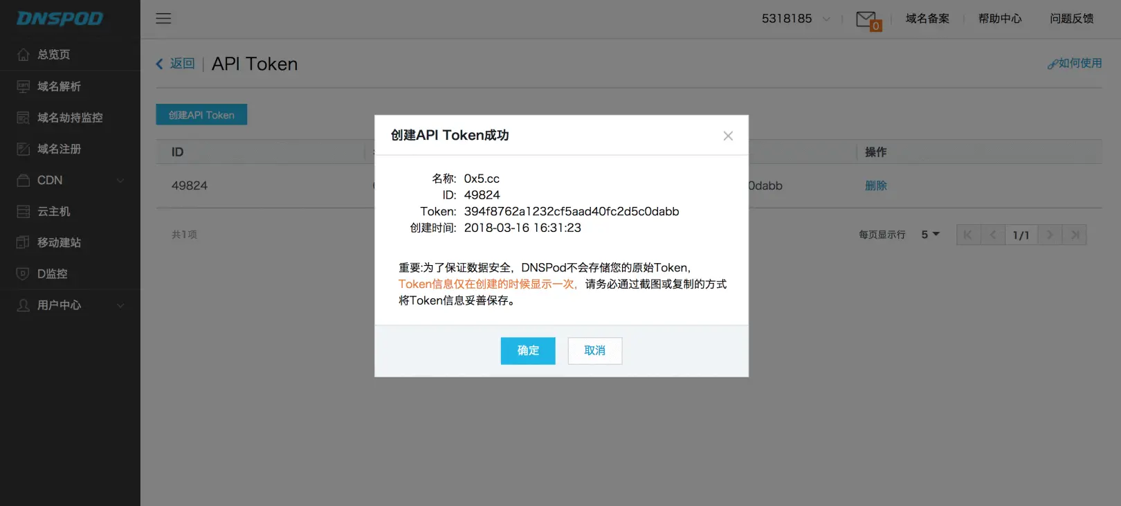 但是acme.sh不是随随便便就就能操作当前域名的DNS解析记录的,必须通过当前域名的域名注册服务商授权才可以。这就需要用到了API token