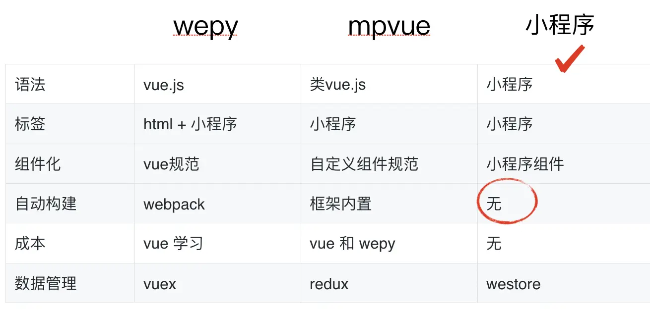 由于小程序更新迭代速度很快,而且我们的技术栈是 react 全家桶,所以在对比 wepy 和 mpvue 之后,我们选择了直接使用原生小程序。对比图如下: