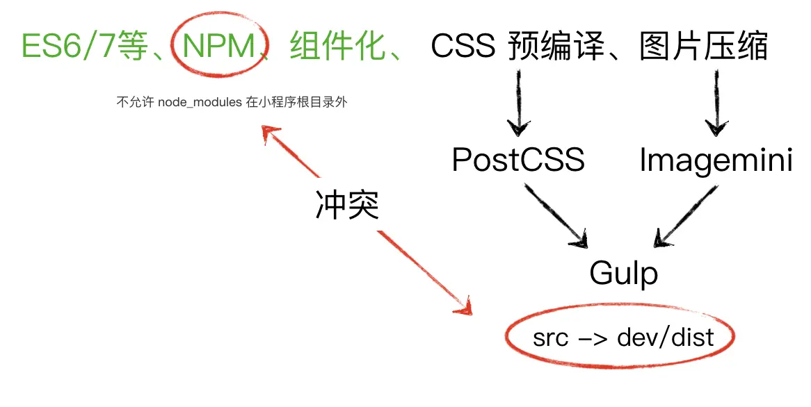 一般来说,运行构建命令,我们都会从一个源目录(src)到一个目标目录(dev/dist),但是小程序的 NPM 能力是不允许 node_modules 在根目录之外的,这就有了冲突。总不能跑个任务拷贝整个 node_modules 到目标目录吧。
