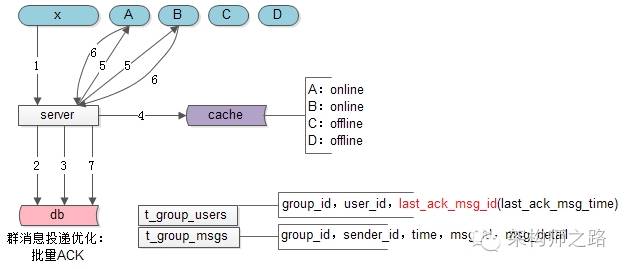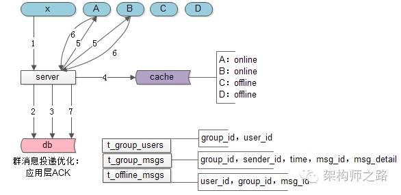 步骤2:server去db中查询群中有多少用户(x,A,B,C,D);
