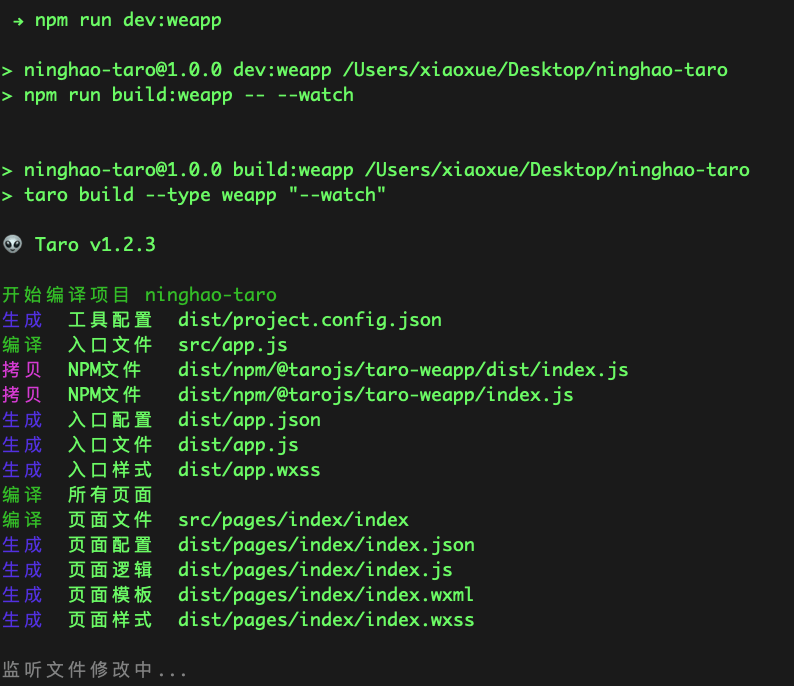 命令会把应用编译成微信小程序放在指定的目录下面,同时会监听相关文件的变化 ,有变化会重新编译需要的东西。