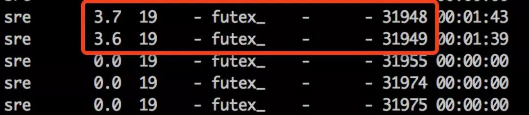 2.根据pid,查找占用cpu较高的线程:ps -mp pid -o THREAD,tid,time 如图所示:找到占用cpu最高的tid (可以使用sort命令排序:sort -k 3 -r -n)