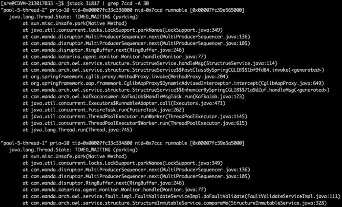 #!/bin/bash## 当JVM占用CPU特别高时,查看CPU正在做什么# 可输入两个参数:1、pid Java进程ID,必须参数 2、打印线程ID上下文行数,可选参数,默认打印10行#pid=$1if test -z $pidthen echo "pid can not be null!" exitelse echo "checking pid($pid)"fiif test -z "$(jps -l | cut -d '' -f 1 | grep $pid)"then echo "process of $pid is not exists" exitfilineNum=$2if test -z $lineNumthen $lineNum=10fijstack $pid >> "$pid".bakps -mp $pid -o THREAD,tid,time | sort -k2r | awk '{if ($1 !="USER" && $2 != "0.0" && $8 !="-") print $8;}' | xargs printf "%x\n" >> "$pid".tmptidArray="$( cat $pid.tmp)"for tid in $tidArraydo echo "******************************************************************* ThreadId=$tid **************************************************************************" cat "$pid".bak | grep $tid -A $lineNumdonerm -rf $pid.bakrm -rf $pid.tmp