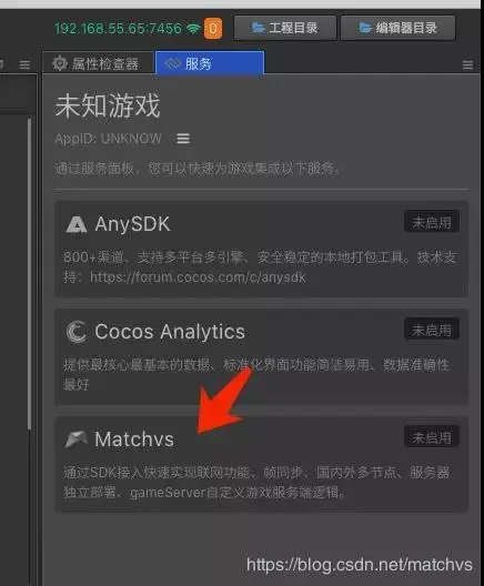 3、游戏创建完成后,返回 Cocos Creator 服务面板,完成设定 Cocos AppID,这样你的本地游戏代码就与你账户中的游戏建立关联了。再次点击 Matchvs 项,进入 Matchvs 面板,点击右上角开启服务,Matchvs SDK 将会自动集成到您的游戏项目的 assets/scripts/matchvs 目录中,最后参考[使用指南]直接调用相关功能 API 即可。