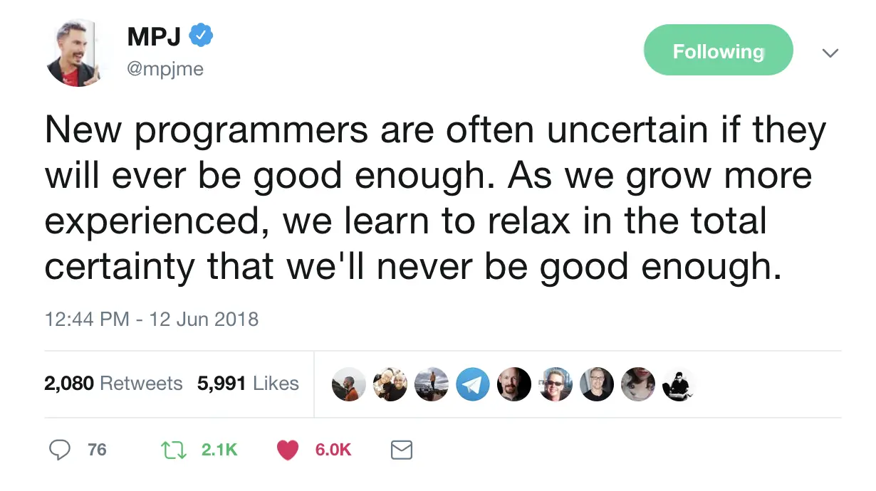 And my second most favorite tweet during my time of struggle was from one of the finest developers and the author of the You Don’t know JS series, Kyle Simpson.