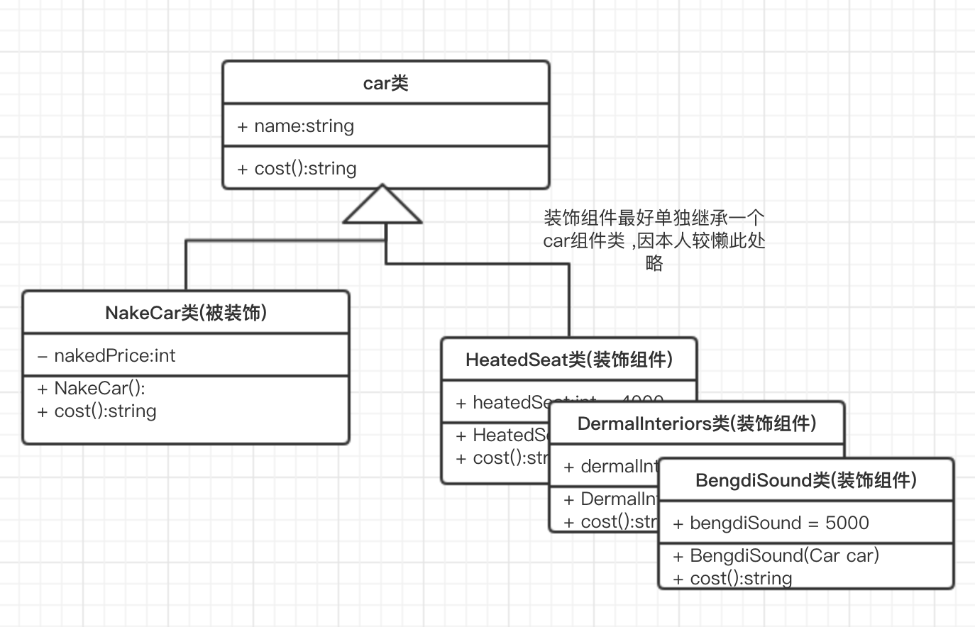 装饰模式的优点: 可以为已有的功能(被装饰对象)动态的添加功能,简化原有类。在我们的例子中, 裸车是主类,相当于业务中的核心,而一些动态的组件可以根据实际情况使用,也就相当于我们业务线中的附属拓展功能。