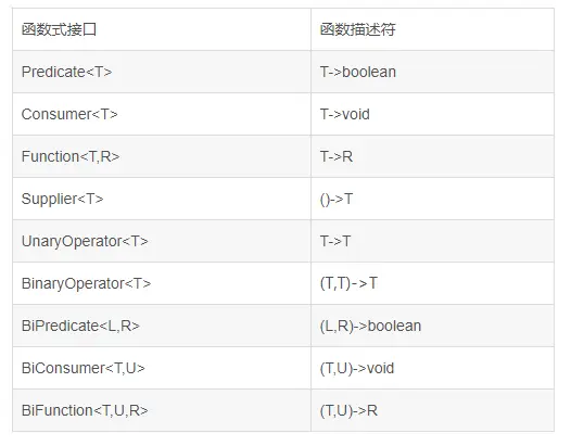 函数式接口 函数描述符 Predicate T->boolean Consumer T->void Function<T,R> T->R Supplier ()->T UnaryOperator T->T BinaryOperator (T,T)->T