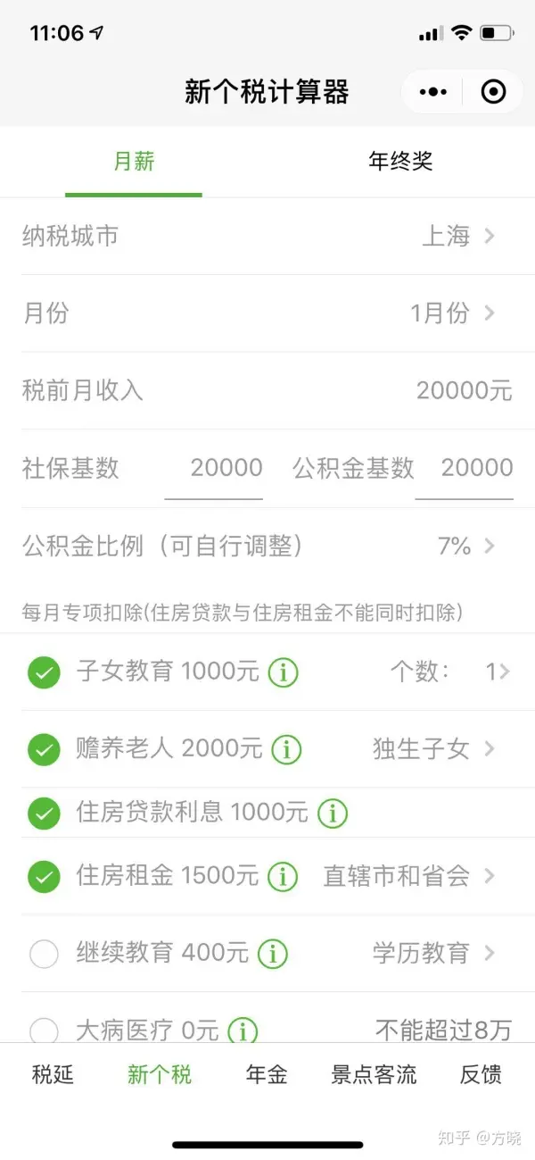 支持起征点5000,专项扣除,假设小明在上海工作,他是独生子女,税前薪资2万,有一个娃(超过3岁),父母其中有一个超过60,首套房有贷款。