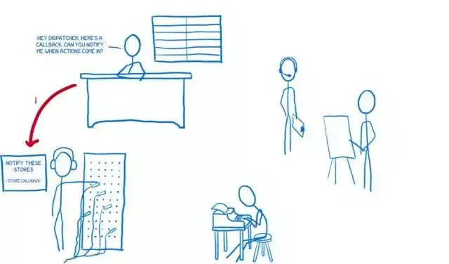 The dispatcher 翻译过来就是调度员的意思,所有的Action传递到这里后,统一由它进行调度。The dispatcher 注册了对应的回调函数,就像一个管理电话交换机的管理员,它会把Action传递给对应store。store只会接受处理自己关心的Action,不符合的Action将会被无视。