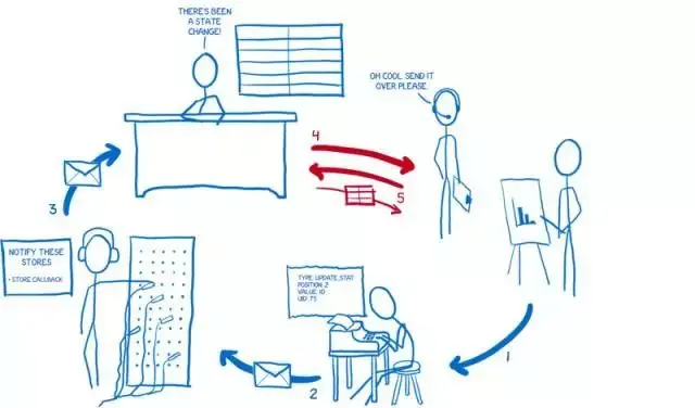 4. The controller views 告诉 the stores 时刻保持联系,以便他们能做及时的反馈与响应呈现给用户。