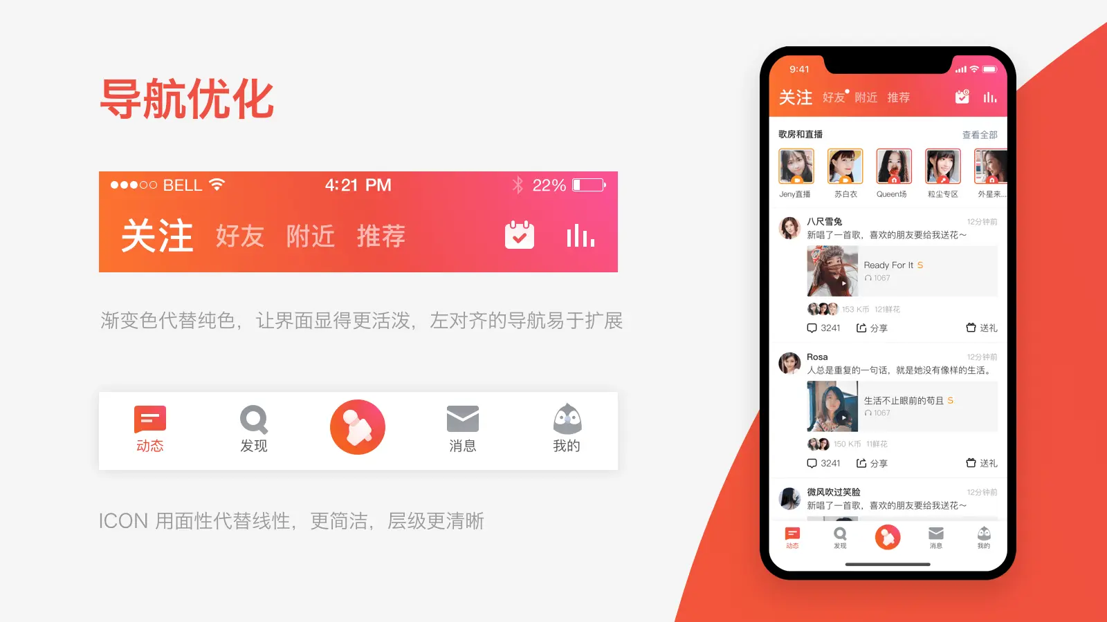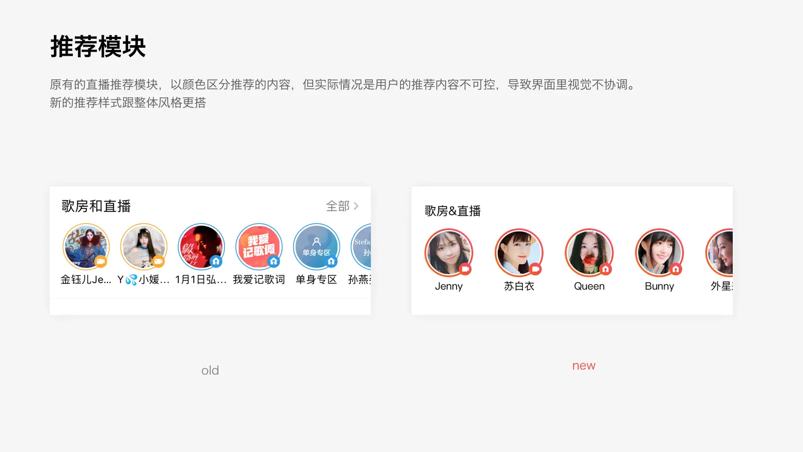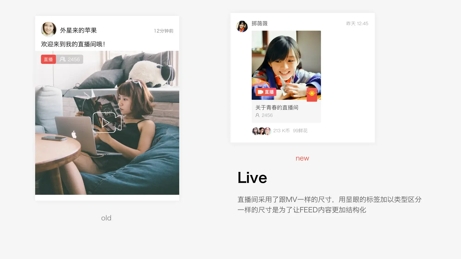 将歌房和直播也梳理成跟mv一致的尺寸。减少Feed流中不同规格的feed带来的界面混乱,提升一致性。