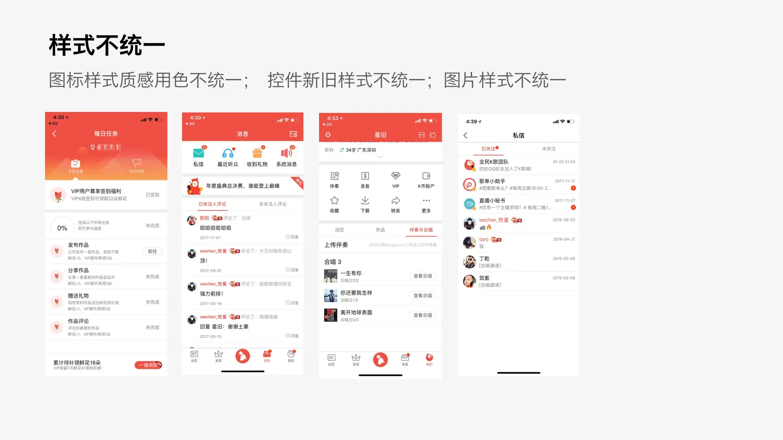 风格稿确定虽然是改版中最重要的环节但并不是全部,风格稿确定的只是关键界面。K歌的功能界面纷繁复杂,将关键界面的设计延展到所有界面并保证其一致性需要一套简介明确的规则。而规则就是一系列判断取舍的集合体。好的规则应该是简洁自洽的,是为美。