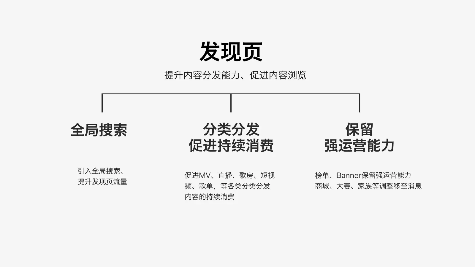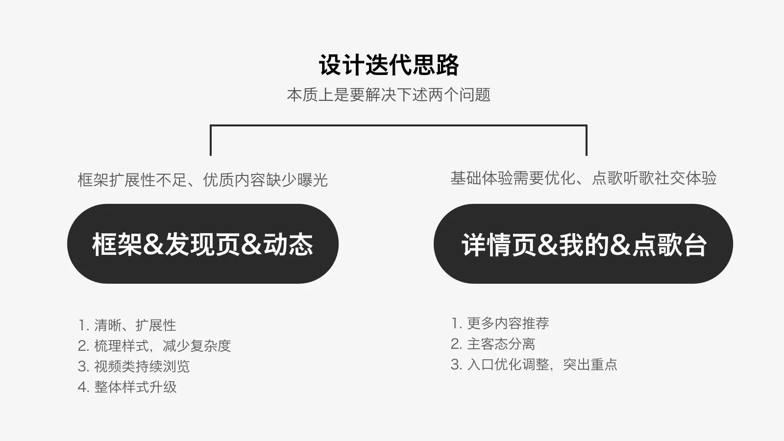产品方的主要诉求是对appUI的升级。但是我觉得作为一个大的、关键性的改版,仅仅UI升级是不够的,是还欠缺一些什么的。于是我想将5.0的改版拔高一个高度,不仅限于UI,而是一个整体的全面的改版。我将改版内容分为三部分:UI升级、品牌升级、VIP升级。后两者是设计主动提出推动的。品牌升级是因为全民K歌往期都没有健全的品牌KV体系,外部宣传时候设计随意性太大,想这次改版完善品牌体系。VIP升级是因为之前K歌的VIP没有独立的视觉体系,随着增值营收业务的增长,这部分诉求逐渐增长,现有的视觉样式最贵感不够。